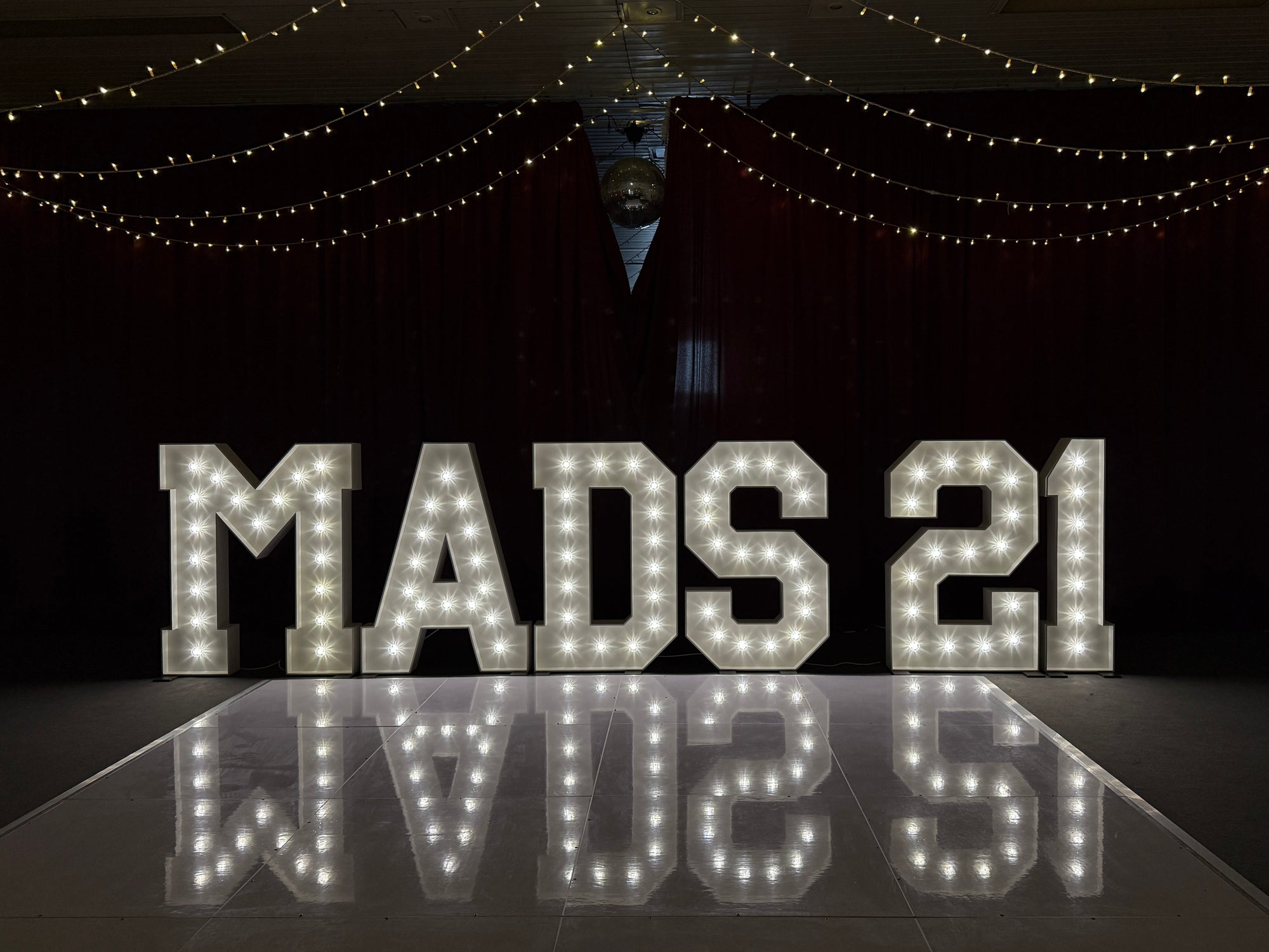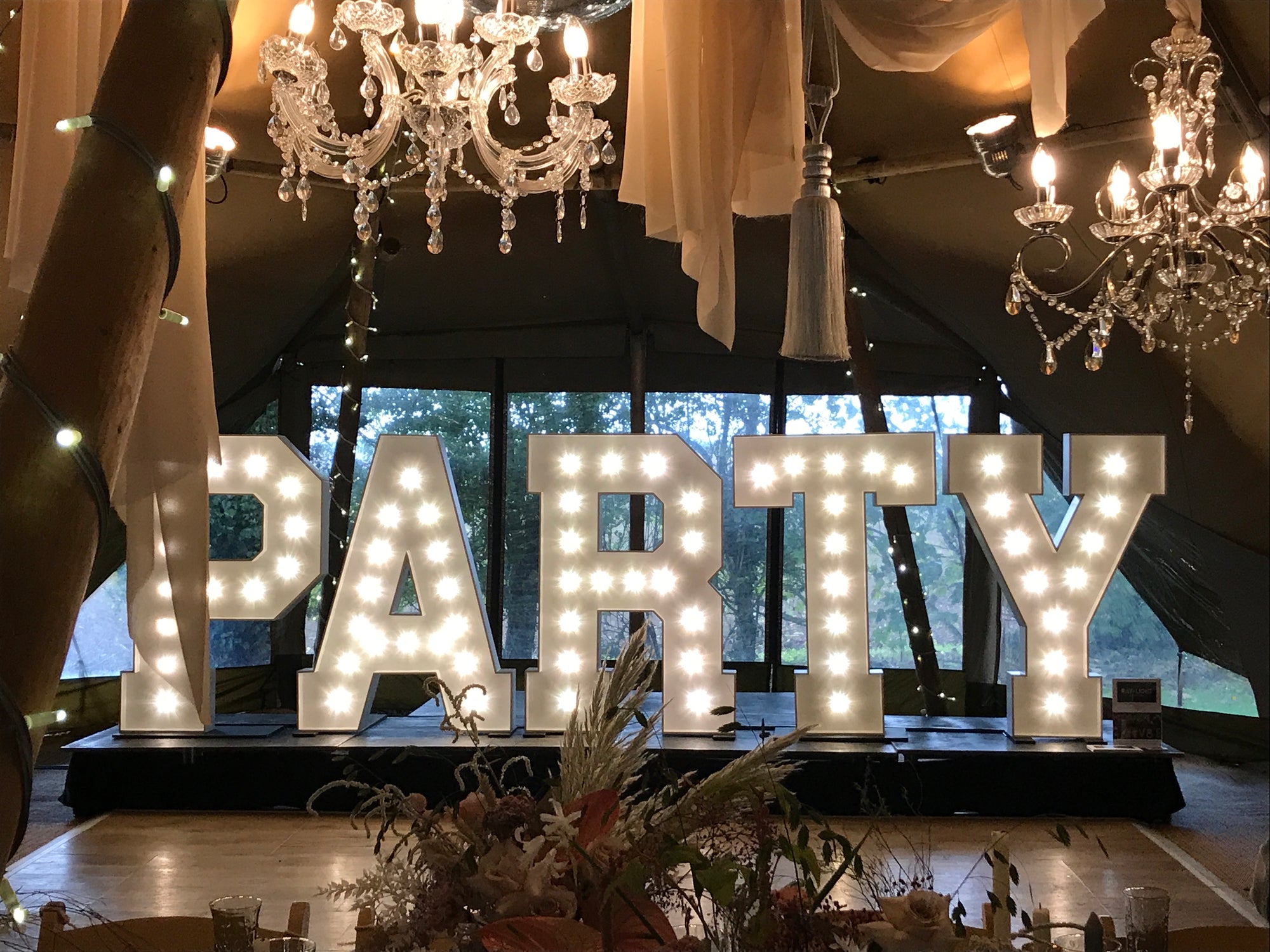 Our LED letters are mains powered for consistent brightness and reliability — ideal for long event hours.